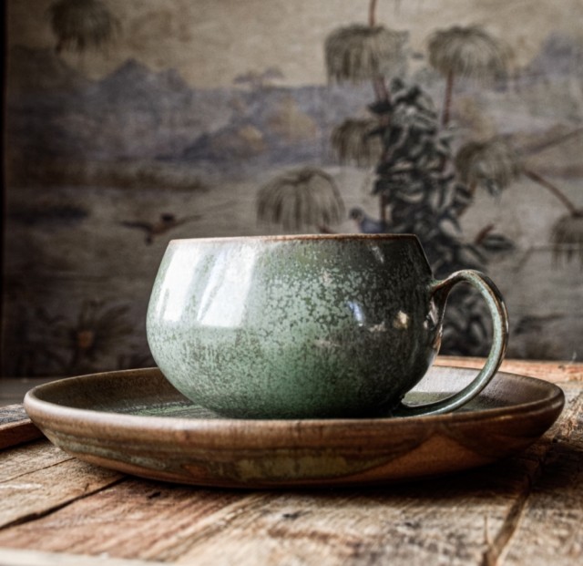 Stor og god kakapo eller tekopp som ligg godt i handa. Glasuren er den mest spennende glasuren me har på Reinrosa produkta, den er brenntgrøn og endrar seg litt for kvar produksjon. Nokre gongar er glasuren metta og blank, andre gongar kjem den ut av ovnen i ein meir brennt grønn farge. Det er mykje spel og ugjevn effekt i denne glasuren. Derfor kan glasusren framstå som tynn enkelte stader mens den kanskje renn andre stader. Den kan variere mellom ein brent brunfarge, grøn og enkelte stader lys gul på same kopp.